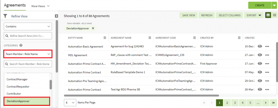 5. Select the checkbox for DeviationApprover to view the Agreements where approval is pending from Deviation Approvers. All Agreements where the Status is Deviation Approval Pending are displayed.